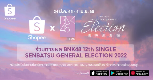 สาวก BNK48 ห้ามพลาด! กับกิจกรรม Shopee x BNK48 ร่วมทายผล BNK48 12th Single Senbatsu General Election 2022 เอ็กซ์คลูซีฟเฉพาะที่ช้อปปี้เท่านั้น สามารถดูรายละเอียดเพิ่มเติมและศึกษาเงื่อนไขการร่วมกิจกรรมได้ที่ https://shopee.co.th/m/bnk48-12th-election