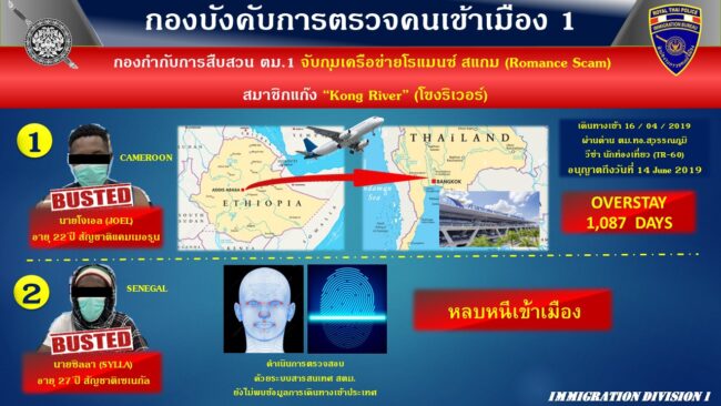 แต่จากการตรวจสอบเพิ่มเติม ปรากฏว่าเจ้าหน้าที่ชุดจับกุมพบข้อมูลภายในโทรศัพท์เคลื่อนที่ของผู้ถูกจับทั้ง 2 รายพบว่า มีการพูดคุยในลักษณะเชิงชู้สาว กับหญิงสาวทั้งชาวไทย ลาว และเมียนมา ในแอปพลิเคชันแชท What app, Line และ Messengers โดยจะแสดงตนว่าเป็นนักธุรกิจชาวต่างชาติที่มีฐานะดี ซึ่งทุกรายอยู่ในระหว่างการติดต่อพูดคุยเพื่อหลอกลวง แต่เหยื่อยังไม่ทันหลงเชื่อจนถึงขั้นโอนเงินให้ จนถูกเจ้าหน้าที่จับกุมได้เสียก่อน จากการตรวจสอบเอกสารการเข้าเมืองและวีซ่า พบว่านายโจเอล อายุ 22 ปี สัญชาติแคมารูน ผู้ถูกจับที่ 1 มีหนังสือเดินทางแต่การอนุญาตให้อยู่ในราชอาณาจักรสิ้นสุดลงแล้ว จำนวน 1,087 วัน และ นายซิลลา อายุ 27 ปี สัญชาติ เซเนกัล ผู้ถูกจับที่ 2 ไม่มีหนังสือเดินทางมาแสดง เจ้าหน้าที่ชุดจับกุมได้แจ้งข้อหาให้นายโจเอล ผู้ถูกจับกุมที่ 1 ทราบว่า “เป็นคนต่างด้าวเข้ามาและอยู่ในราชอาณาจักรโดยการอนุญาตสิ้นสุด” และนายซิลลา ผู้ถูกจับที่ 2