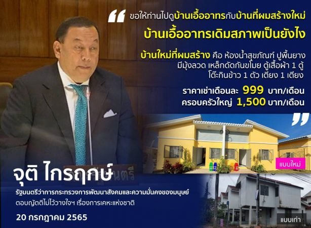 รมว.พม. ชี้แจงอภิปรายไม่ไว้วางใจเรื่องทุจริตในการเคหะแห่งชาติ พร้อมให้ตรวจสอบ ยันคนจนต้องมีที่อยู่ ประชาชนต้องได้ประโยชน์เพิ่มขึ้น :