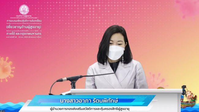 วันที่ 18 สิงหาคม 2565 เวลา 09.00 น. นางสุจิตรา พิทยานรเศรษฐ์ อธิบดีกรมกิจการผู้สูงอายุ เป็นประธานในพิธีเปิด การอบรมเชิงปฏิบัติการขับเคลื่อนการดำเนินงานอาสาสมัครพัฒนาสังคมและความมั่นคง ของมนุษย์ (เชี่ยวชาญด้านผู้สูงอายุ) ในช่วงการระบาดของโรคติดเชื้อไวรัสโคโรนา 2019 (COVID – 19) ภาคใต้ และกรุงเทพมหานคร เพื่อเสริมสร้างความรู้ ความเข้าใจ แก่อาสาสมัครพัฒนาสังคมและความมั่นคงของมนุษย์ (เชี่ยวชาญด้านผู้สูงอายุ) อาสาสมัคร และบุคลากรที่สนใจเป็นขับเคลื่อนกลไกการเฝ้าระวัง ดูแล ช่วยเหลือ และคุ้มครองพิทักษ์สิทธิผู้สูงอายุ ในช่วงการระบาดของโรคติดเชื้อไวรัสโคโรนา 2019 (COVID – 19)