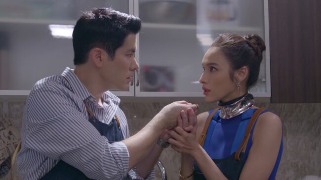 ฉากนี้ถือว่าได้พักยกความหลอน โหดตามล่าเหยื่อรายใหม่กันสักพักเพราะแค่เห็นออเดิร์ฟเบื้องหลังฉากนี้ บอกได้คำเดียวว่า เตรียมฟินสุดใจกับความรักของปี๋และสักการ เพราะทั้ง หยาดทิพย์ และ สมาร์ทที่ต้องจูบกันนัวแบบร้อนแรงสุดๆ ไม่ใช่แค่จูบกันอย่างดูดดื่มใกล้ชิดกัน จนสามารถรับรู้ถึงลมหายใจของกันและกันเท่านั้น แต่ทั้งคู่ยังต้องสื่ออารมณ์ความรักของตัวละครให้ชัดขึ้นอีกด้วย แถมสมาร์ทต้องสร้างรัก และแอ๊บตีเนียนท้าพิสูจน์ไปพร้อมกัน ส่วนหยาดก็ต้องคอยระแวง คอยระวังแบบไม่พัก แถมผู้กำกับจัดฉากทำอาหาร ให้หยาดทำอาหารจริงเสียเลย บอกเลยว่านอกจากกลิ่นความรักที่หอมฟุ้ง ก็ไม่เท่ากลิ่นสเต๊กเนื้อร้อนๆที่ยั่วใจก่อนพักเที่ยงแน่นอน พร้อมกับการจัดท่าทางเอนตัวซ้อมจูบหามุมกล้องให้ดูว่ามุมไหนเร้าใจแฟนๆที่สุด พอถึงเวลาถ่ายทำจริง สมาร์ทเอาใจหยาด เพื่อหวังหาวิธีเปิดโปงความลับว่าคอของหยาดมีรอยเย็บจริงหรือไม่ แถมต้องทำโรแมนติกเอาใจผูกผ้ากันเปื้อนแสดงความรัก และความเอาใจใส่ในตัวปี๋ งานนี้หยาดตายใจ เลยเคลิ้มตาหวาน ขอจูบแบบเร้าใจ และด้วยลีลาเร่าร้อนบวกกับความสวยของปี๋ ทำสมาร์ทเคลิ้ม จับหยาดอุ้มเข้าไปสร้างความโรแมนติกที่ห้องกันต่อ สมาร์ทพยายามหาจังหวะดึงโชคเกอร์ที่คอปี๋ งานนี้ต้องมาลุ้นกันว่า สมาร์ทจะทำสำเร็จหรือไม่ แล้วหยาดจะหาวิธีหลีกเลี่ยงความลับนี้อย่างไร ติดตามชมได้ใน ละคร “ศีรษะมาร” วันอังคารที่ 6 กันยายนนี้ เวลา 20.30 น. ทางหน้าจอช่อง 8 กดเลข 27 และสามารถดูย้อนหลังบนแอปพลิเคชัน iQIYI และเว็บ www.iQ.com