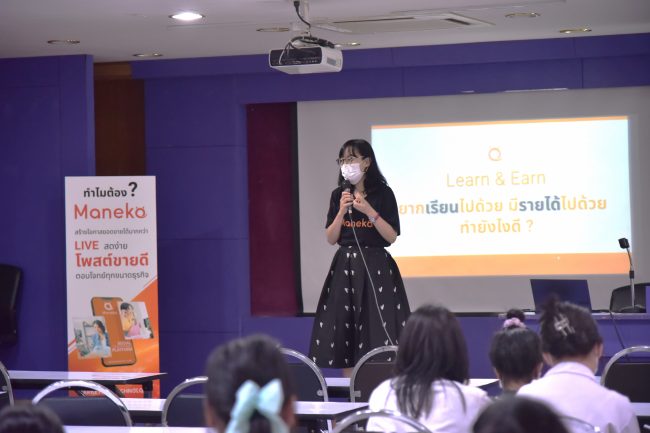 ภายในงานเวิร์คช้อป นอกจากน้องๆ นักศึกษาจะได้เห็นแพลตฟอร์มจริงในการทำงาน แต่ละคนยังได้โชว์ศักยภาพในการขายสินค้าผ่านระบบไลฟ์คอมเมิร์ซ และการโพสต์ขายสินค้าในรูปแบบอื่นๆ ผ่านระบบ Maneko แบบลงมือทำจริง นอกจากแต่ละคนจะสนุกไปกับการทำรีวิวขายสินค้า ยังได้แนวทางในการสร้างรายได้แบบใหม่ให้กับตัวเองอีกด้วย