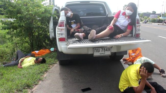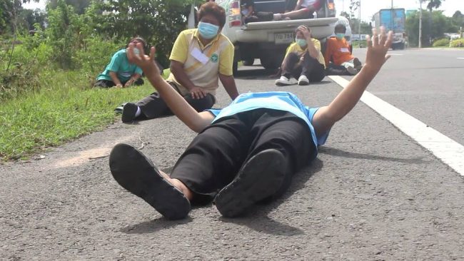 โดยทางกําหนดการซ้อมแผ่นนั้นเริ่มซ้อมแผ่นช่วงเวลา 13.00 น. เจ้าหน้าที่ตำรวจจราจร สภ.รัตนบุรี พร้อมกําลังทำการปิดกั้นถนนอํานวยความสะดวกด้านจราจร และทางเจ้าหน้าที่ของโรงพยาบาลรัตนบุรีพร้อมด้วยเจ้าหน้าที่กู้ชีพกู้ภัยได้แต่งตัวทาสีให้คลายกับผู้บาดและผู้เสียชีวิตมาจําลองเหตุการณ์ขึ้นตั้งแต่เวลา 13.00 น. โดยผู้แสดงต่าง นั่งรอ นอนรอ ด้วยบรรยากาศท้องฟ้าแสงแดดร้อนเปรี้ยงๆ จนล่วงเวลาไปเกือบชั่วโมงศูนย์สั่งการโรงพยาบาลรัตนบุรีก็ยังไม่เริ่มจนทำให้เจ้าหน้าที่ที่แสดงเป็นผู้บาดเจ็บและเสียชีวิต ต่างส่งเสียงร้องเสียงฮากันไปจนทำให้ผู้ที่มาชมจําลองเหตุการณ์ต่างยิ้มหัวเราะไปด้วย