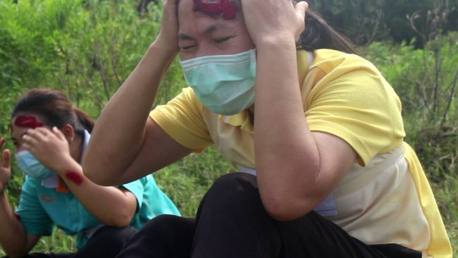 จากนั้นเริ่มมีการซ้อมแผนขึ้นโดยมีทีมงานเจ้าหน้าที่ที่ควบคุมการชักซ้อมแผนได้บรรจุแผนผเชิญเหตุว่าในที่เกิดเหตุนั้นมีเสียงระเบิดเกิดขึ้นด้วยโดยไม่แจ้งให้ทราบล่วงหน้าก่อนจะมีทีมหมอ พยาบาล กู้ภัย ที่วิ่งเข้าไปช่วยเหลือจู่ๆ ก็มีเสียงประทัดยักษ์ดังสนั่น2ครั้งใกล้บริเวณจุดซ้อมแผนก่อนทีมกู้ชีพหมอ, พยาบาล, กู้ภัย, ทุกคนจะวิ่งตื่นออกมาจากจุดเกิดเหตุและงุนงงโดยไม่ทราบล่วงหน้า..ก่อนจะควบคุมการซ้อมแผนได้ตามปกติลุลวงไปด้วยดี…..เล่นเอาส่งเสียงฮาไปตามๆกัน