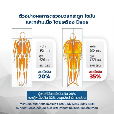 การตรวจวัดองค์ประกอบร่างกาย (Body Composition Analysis) เพื่อวิเคราะห์ความหนาแน่นของมวลกระดูก มวลไขมัน และมวลกล้ามเนื้อ ด้วยเครื่อง DEXA scan ทำให้ทราบข้อมูลของร่างกายมากกว่าการใช้น้ำหนักตัวเพียงอย่างเดียว เนื่องจากคนที่มีน้ำหนักตัวเท่ากัน สามารถมีองค์ประกอบร่างกายที่แตกต่างกันได้ การตรวจวัดองค์ประกอบร่างกาย จึงเพิ่มความแม่นยำในการบ่งชี้ภาวะโรคอ้วน โดยในผู้ชายวัยกลางคน ไม่ควรมีเปอร์เซ็นต์ไขมันเกิน 28% และในผู้หญิง ไม่ควรเกิน 32 % รวมไปถึงการตรวจความหนาแน่นของมวลกระดูก เพื่อดูความเสี่ยงของโรคกระดูกพรุน (Osteoporosis) รวมถึงเพื่อรักษามวลกล้ามเนื้อให้อยู่ในเกณฑ์ที่เหมาะสมอยู่เสมอ ป้องกันการพลัดตกหกล้มที่อาจเกิดขึ้นได้