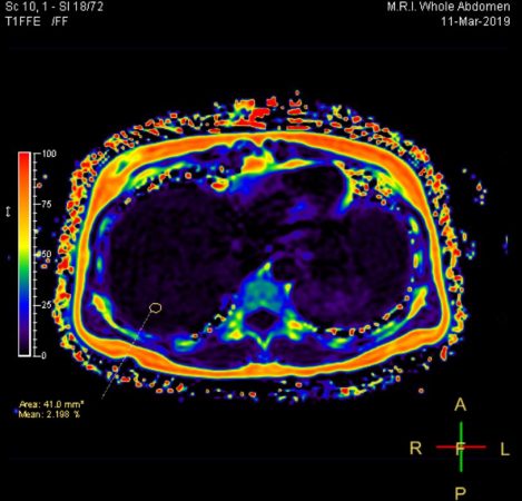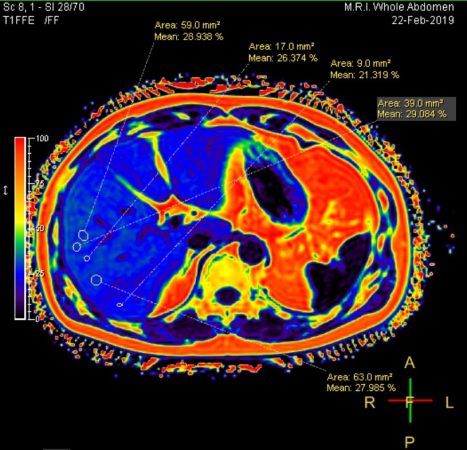 - การตรวจค่าการทำงานของตับ จากเอนไซม์ AST (SGOT) และ ALT (SGPT) ที่ร่างกายสร้างขึ้นเมื่อตับเกิดความเสียหาย เอนไซม์ Alkaline phosphatase (ALP), Gamma GT (GGT) และบิลิรูบิน (bilirubin) เพื่อดูความผิดปกติของตับและการอุดตันของท่อน้ำดี ร่วมกับการตรวจทางรังสีที่ตับและช่องท้อง ได้แก่ อัลตราซาวด์ช่องท้อง (Abdominal Ultrasound) โดยใช้คลื่นความถี่ และการตรวจด้วยเครื่องแม่เหล็กไฟฟ้า หรือการ MRI ช่องท้องความละเอียดสูงแบบไม่ฉีดสี (MRI Whole Abdomen Non-contrast) ช่วยในการประเมินความผิดปกติต่างๆ เช่น เปอร์เซ็นต์ไขมันพอกตับ, ภาวะไขมันพอกตับ (Fatty Liver) และภาวะไขมันพอกตับอ่อน (Fatty Pancreas), ก้อนเนื้อที่ผิดปกติ หรือเนื้องอกที่อาจพัฒนากลายเป็นมะเร็ง, ความผิดปกติที่ท่อน้ำดีและนิ่วในถุงน้ำดี, ฝีในตับ และการไหลเวียนของเส้นเลือดภายในช่องท้อง