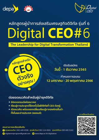 ผู้บริหารที่สนใจร่วมยกระดับองค์ความรู้และทักษะดิจิทัลไปกับหลักสูตรผู้นำการส่งเสริมเศรษฐกิจดิจิทัล (Digital CEO) รุ่นที่ 6 สามารถสมัครได้แล้ววันนี้ – วันที่ 1 ธันวาคม 2565 ดูรายละเอียดเพิ่มเติมได้ที่ www.depa.or.th/digitalceo