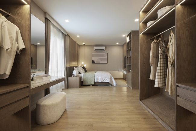 การออกแบบพื้นที่ – การบริหารจัดการ Space ในชั้น 2 ที่ได้ Master Bedroom บนพื้นที่ขนาดใหญ่ จำนวน 2 ห้อง และห้องนอนชั้น 1 ที่เป็นได้ทั้งห้องอเนกประสงค์ ห้องทำงาน และห้องอื่นๆ รวมถึงการออกแบบ Living Space ที่มากถึง 2 จุดภายในบ้าน