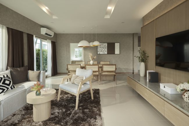 การออกแบบพื้นที่ – มากกว่าด้วย พื้นที่ที่เติมเต็มความสุขของทุกคนในครอบครัว เพิ่มเสน่ห์ของการใช้พื้นที่ในชั้นล่าง ด้วยการเชื่อมต่อ Outdoor Space เข้ากับ Indoor Space ทั้งด้านหน้าและด้านข้างบ้าน ซึ่งสามารถจัดกิจกรรมที่หลากหลาย เช่น BBQ Outdoor Dinning สำหรับกิจกรรมของครอบครัว และโถงในชั้นล่างที่สามารถปรับเป็น มุมทำงาน มุมอ่านหนังสือ มุมนั่งเล่น รวมถึง พื้นที่เก็บของในทุกๆ มุมของบ้าน