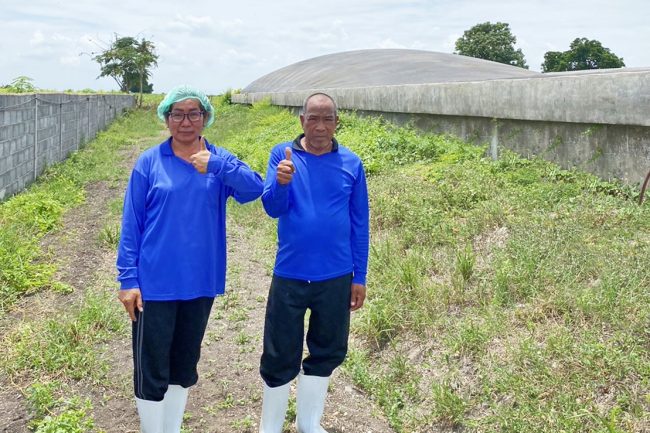 นอกจากนี้ทั้งคู่ยังต่อยอด “เปลี่ยนขี้หมูเป็นทอง” โดยไพรัตน์ใช้ทักษะด้านงานช่าง คิดค้นสร้างเครื่องอัดเม็ด เพื่อนำกากขี้หมูที่ผ่านการบำบัดในระบบไบโอแก๊สแล้วมาอัดเม็ด กลายเป็น ‘ปุ๋ยขี้หมูอัดเม็ด’ อีกกิจการในครัวเรือนที่สร้างรายได้เสริมอีกประมาณ 4-5 หมื่นบาทต่อเดือน ขณะเดียวกัน น้ำหลังจากการบำบัด หรือที่เรียกว่า “น้ำปุ๋ย” ที่มีแร่ธาตุที่พืชต้องการสูง ยังถูกแบ่งปันให้กับเกษตรกรรอบข้างที่ติดต่อผ่านองค์กรปกครองส่วนท้องถิ่น เพื่อขอรับน้ำปุ๋ยใช้บำรุงต้นพืช ช่วยลดค่าใช้จ่าย ลดการใช้ปุ๋ยเคมี และช่วยให้เกษตรกรโดยรอบผ่านพ้นวิกฤติแล้งมาตลอด โดยทางฟาร์มสนับสนุนการต่อท่อ ติดเครื่องปั๊มน้ำ และซื้อน้ำมันเติมเครื่องให้ทั้งหมด