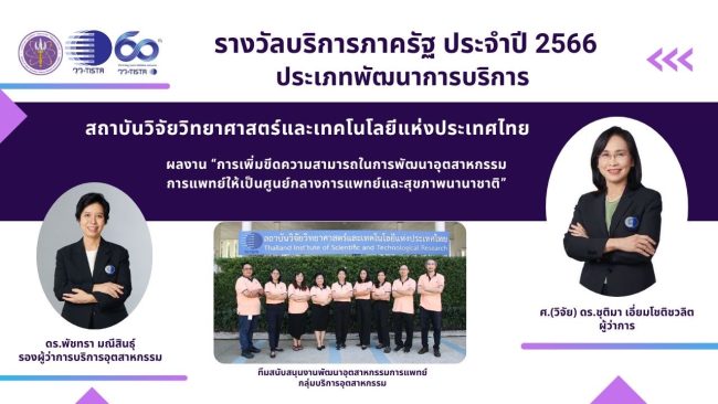 นายวิษณุ เครืองาม รองนายกรัฐมนตรี เป็นประธานในพิธีมอบรางวัลเลิศรัฐ ประจำปี 2566 จัดโดย คณะกรรมการพัฒนาระบบข้าราชการ (ก.พ.ร.) ในการนี้ นายไมตรี อินทสุต กรรมการ ก.พ.ร. ได้มอบรางวัล “บริการภาครัฐระดับดี ประเภทพัฒนาการบริการ” จากผลงาน “การเพิ่มขีดความสามารถในการพัฒนาอุตสาหกรรมการแพทย์ ให้เป็นศูนย์กลางการแพทย์และสุขภาพนานาชาติ” ให้แก่ ดร.พัชทรา มณีสินธุ์ รองผู้ว่าการบริการอุตสาหกรรม สถาบันวิจัยวิทยาศาสตร์และเทคโนโลยีแห่งประเทศไทย (วว.) กระทรวงการอุดมศึกษา วิทยาศาสตร์ วิจัยและนวัตกรรม   (อว.) ในฐานะผู้แทน วว. ซึ่งผลงานดังกล่าวมุ่งการมีส่วนร่วมพัฒนาผลิตภัณฑ์ชิ้นส่วนวัสดุอุปกรณ์ทางการแพทย์ให้มีคุณภาพ เป็นที่ยอมรับตามมาตรฐานสากล มีความปลอดภัย เพิ่มศักยภาพให้ผู้ประกอบการทั้งการผลิตและการส่งออก โดยไม่ต้องส่งผลิตภัณฑ์ไปทดสอบต่างประเทศ ลดระยะเวลา ค่าใช้จ่าย ส่งเสริม สนับสนุน ให้ผู้ประกอบการอุตสาหกรรมทางการแพทย์ในประเทศไทย มีผลิตภัณฑ์ที่ได้คุณภาพตามมาตรฐานสากล รวมผลกระทบทางเศรษฐกิจและสังคมจากการดำเนินการจำนวน 470.43 ล้านบาท