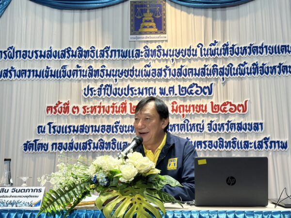 วันที่  24 มิถุนายน 2567 ณ โรงแรมสยาม ออเรียนทัล โฮเทล อำเภอหาดใหญ่ จังหวัดสงขลา กรมคุ้มครองสิทธิฯ จัดฝึกอบรมส่งเสริมสิทธิเสรีภาพและสิทธิมนุษยชน ในพื้นที่จังหวัดชายแดนภาคใต้ เพื่อสร้างความตระหนักต่อการเคารพสิทธิ ไม่ละเมิดสิทธิและไม่ละเมิดกฎหมาย คาดหวังการละเมิดสิทธิลดลง