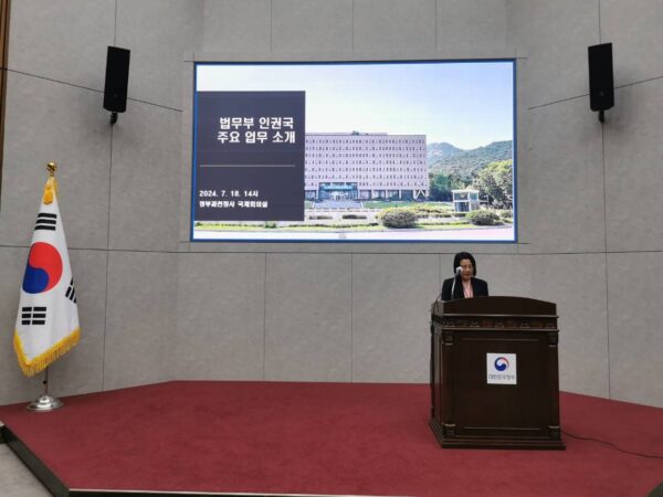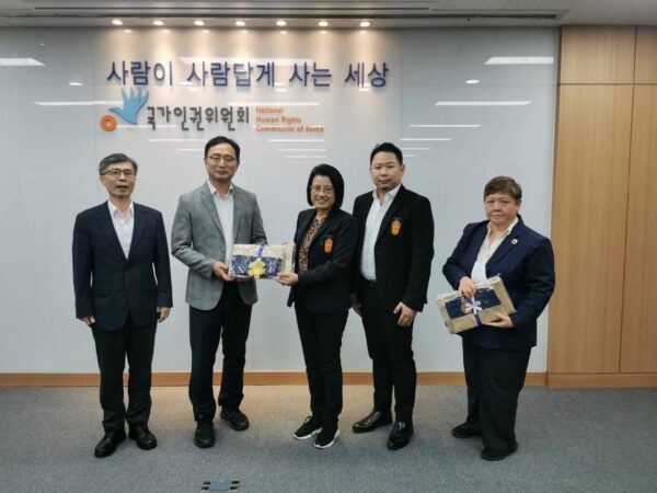 หลังจากนั้น เวลา 14.00 น. เดินทางต่อไปที่ สิทธิมนุษยชนและแผนสิทธิมนุษยชนแห่งชาติ ณ กระทรวงยุติธรรม (Human Rights Bureau, Ministry of Justice) โดยมีผู้บริหารคณะกรรมการสิทธิมนุษยชนเกาหลีใต้ ให้การต้อนรับ และกล่าวถึงบทบาทในนามกรมสิทธิมนุษยชนเกาหลีใต้ ที่มีบทบาทในการป้องกันอาชญากรรมต่างๆ ที่เกี่ยวข้องกับสิทธิมนุษยชน โดยมีความร่วมมือทั้งภายในและต่างประเทศ โดยเกาหลีใต้มุ่งตั้งกรมสิทธิมนุษยชนเพื่อการพัฒนาประเทศให้ดียิ่งขึ้น ซึ่งภายในองค์กรมีแผนกสืบสวนสอบสวน แผนกนโยบาย ซึ่งวันนี้จึงมีการแบ่งปันระหว่างไทยกับเกาหลีใต้มิติด้านสิทธิมนุษยชน