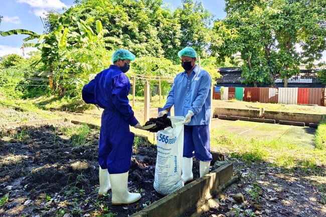 “กากตะกอนดี สู่เกษตรกร” จากกากตะกอนในระบบไบโอแก๊สของทั้งฟาร์มสุกรและโรงงาน ที่ยังมีจุลินทรีย์ดี มีแร่ธาตุสารอาหารที่พืชต้องการ นำไปตากแห้งกลายเป็นปุ๋ยอินทรีย์ชั้นดี โดยมีเครือข่ายร่วมพัฒนา ทั้งสำนักงานอุตสาหกรรมจังหวัด กรมพัฒนาที่ดิน หน่วยงานบริหารส่วนท้องถิ่น นักวิชาการเกษตร CPF และ CPP เพื่อส่งมอบปุ๋ยกากตะกอนให้เกษตรกรรอบหน่วยงาน รวมถึงโครงการผักปลอดภัยชุมชนบ้านด้าย ศูนย์พัฒนาพันธุ์พืชจักรพันธ์เพ็ญศิริ โครงการในพระราชดำริ สมเด็จพระกนิษฐาธิราชเจ้า กรมสมเด็จพระเทพรัตนราชสุดาฯ สยามบรมราชกุมารี ช่วยลดการใช้ปุ๋ยเคมี ลดต้นทุนการผลิต เพิ่มรายได้ ขณะเดียวกัน ฟาร์มในโครงการส่งเสริมฯ สามารถเพิ่มรายได้เสริมจากการกรอกปุ๋ยกากตะกอน