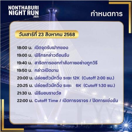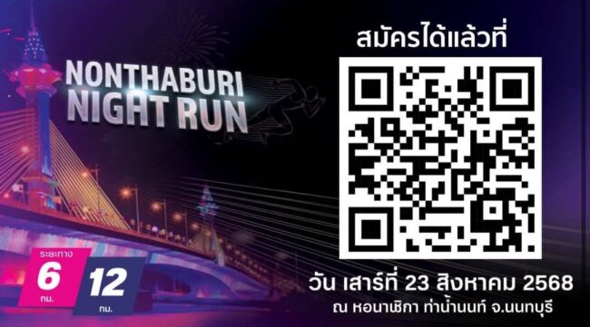 โดยงาน Nonthaburi Night Run 2025 จะจัดขึ้นในคืนวันเสาร์ที่ 23 สิงหาคม 2568 ปล่อยตัวเวลา 20.00 น. ณ หอนาฬิกา ท่าน้ำนนท์ จังหวัดนนทบุรี มีให้เลือก 2 ระยะ นั่นคือ ระยะ 6 กิโลเมตร และ 12 กิโลเมตร สมัครได้แล้ววันนี้ ที่ https://race.thai.run/nonthaburinightrun2025