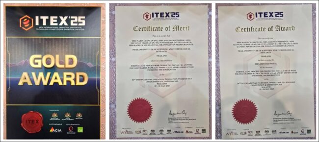 วว. คว้ารางวัลเหรียญทอง ในเวที ITEX 2025 สหพันธรัฐมาเลเซีย จากผลงาน “สูตร/กรรมวิธีผลิตครีมทาหน้า ที่มีส่วนผสมสารสกัดพอลิแซ็กคาไรด์จากสาหร่ายและผลพลอยได้จากจุลินทรีย์โพรไบโอติก” :