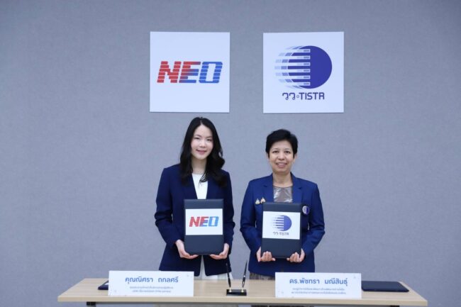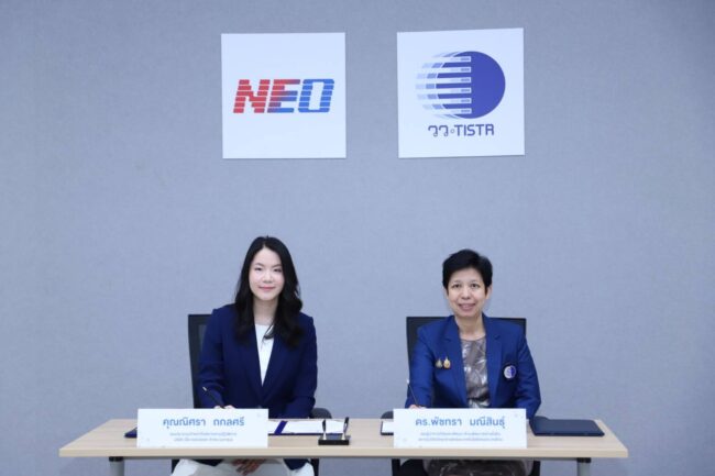 ดร.พัชทรา มณีสินธุ์  รองผู้ว่าการวิจัยและพัฒนาด้านพัฒนาอย่างยั่งยืน สถาบันวิจัยวิทยาศาสตร์และเทคโนโลยีแห่งประเทศไทย (วว.) กระทรวงการอุดมศึกษา วิทยาศาสตร์ วิจัยและนวัตกรรม (อว.) และนางสาวณิศรา ถกลศรี รองประธานเจ้าหน้าที่บริหารสายปฏิบัติการ บริษัท นีโอ คอร์ปอเรท จำกัด (มหาชน) หรือ NEO ร่วมลงนามบันทึกข้อตกลงความร่วมมือเชิงบูรณาการระหว่าง วว. และบริษัท นีโอ แฟคทอรี่ จำกัด ในการประยุกต์ใช้องค์ความรู้และนวัตกรรมจากผลงานวิจัยด้านวิทยาศาสตร์ เทคโนโลยีและนวัตกรรม (วทน.) สู่ภาคอุตสาหกรรมและชุมชนอย่างเป็นรูปธรรม พร้อมขับเคลื่อนเครือข่ายด้านการจัดการขยะแบบองค์รวม ควบคู่กับการสร้างงาน สร้างอาชีพ  ยกระดับคุณภาพชีวิตของชุมชนให้ยั่งยืน ระยะเวลาดำเนินการ 3 ปี