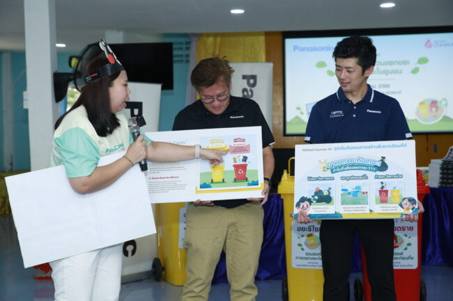 นอกเหนือจากการมอบสิ่งของที่จำเป็นต่อชุมชนที่มีความต้องการแล้ว โครงการ Panasonic Cares ยังมุ่งเน้นการปลูกฝังพฤติกรรมที่ดีด้านสิ่งแวดล้อมในระยะยาวให้แก่เยาวชนและคนในชุมชน ด้วยการสร้างวินัยในการแยกขยะ และการลดมลภาวะที่เกิดจากปัญหาขยะ ผ่านกิจกรรม “พานาโซนิค ชวนแยกขยะ ลดมลภาวะในชุมชน” ด้วยการจัดทำ “ชุดถังขยะแยกประเภท” มอบให้แก่โรงเรียนและชุมชนทั่วประเทศ พร้อมกันนี้ยังได้นำทีมพนักงานลงพื้นที่ให้ความรู้แก่เยาวชนถึงการแยกขยะแบบถูกวิธี
